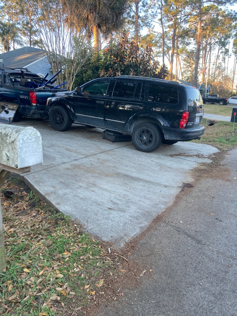 There’s a lot to notice in this picture I took on an evening walk with the big dog. Besides the inside of a car door, a truck full of blue metal, and a vintage mail box, I spied a suitcase underneath the SUV.