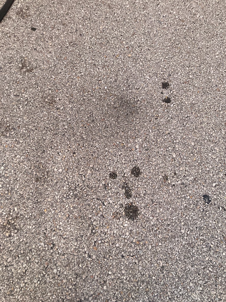 I pass this little patch of asphalt just about every day when walking the dogs. Oil drips form a face that is surprised to see me as I am.