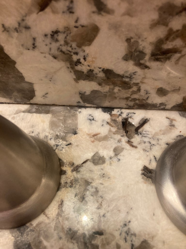 Here’s another one, in the granite of my bathroom sink, sleepily looking back at me whenever I’m brushing my teeth.
