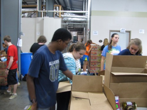 Our last full day of the mission trip (Thursday, July 10) was a flip-flop of day three. My work crew spent our morning at Audubon Acres widening a trail, followed by an afternoon at the food bank, sorting donated food. We went through box after box of non-perishable food, everything from canned beans to fruit snacks. And pickles. Jar after jar after jar of pickles. (Note to self: just donate the basics — canned green beans and corn, pasta and sauce, tuna, peanut butter and cereal. Omit canned artichoke hearts, capers, cream of yuk soup, and pickles.)
