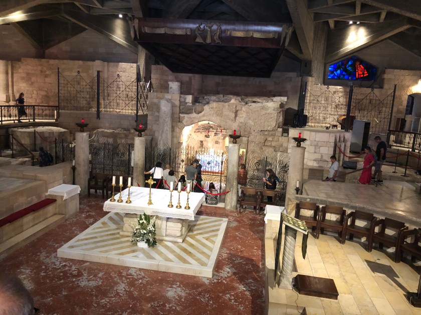 The city of Nazareth was old and kind of dirty. The closer we got to the Church of the Annunciation, the more souvenir vendors lined the street. This church is amazing. Beautiful stone architecture and artwork. The grotto on the lower level, supposedly where Gabriel told Mary she would be the mother of our Lord looked liked little more than a small cave. Many tourists knelt there to pray.