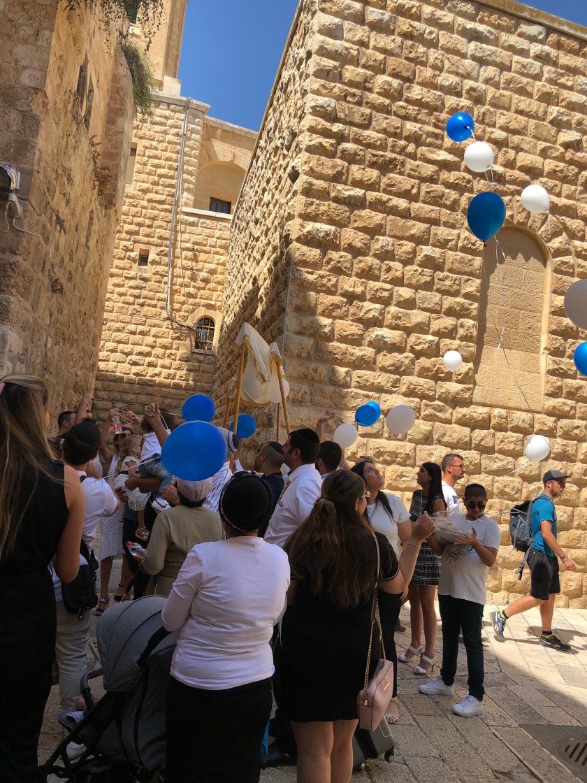 On the way to King David’s tomb, we ran into a special Jewish family celebration. A little three-year old boy was about to get his first haircut! He didn’t seem too happy about it, but the family and many bystanders joined in songs, cheering, and a blue and white balloon release.