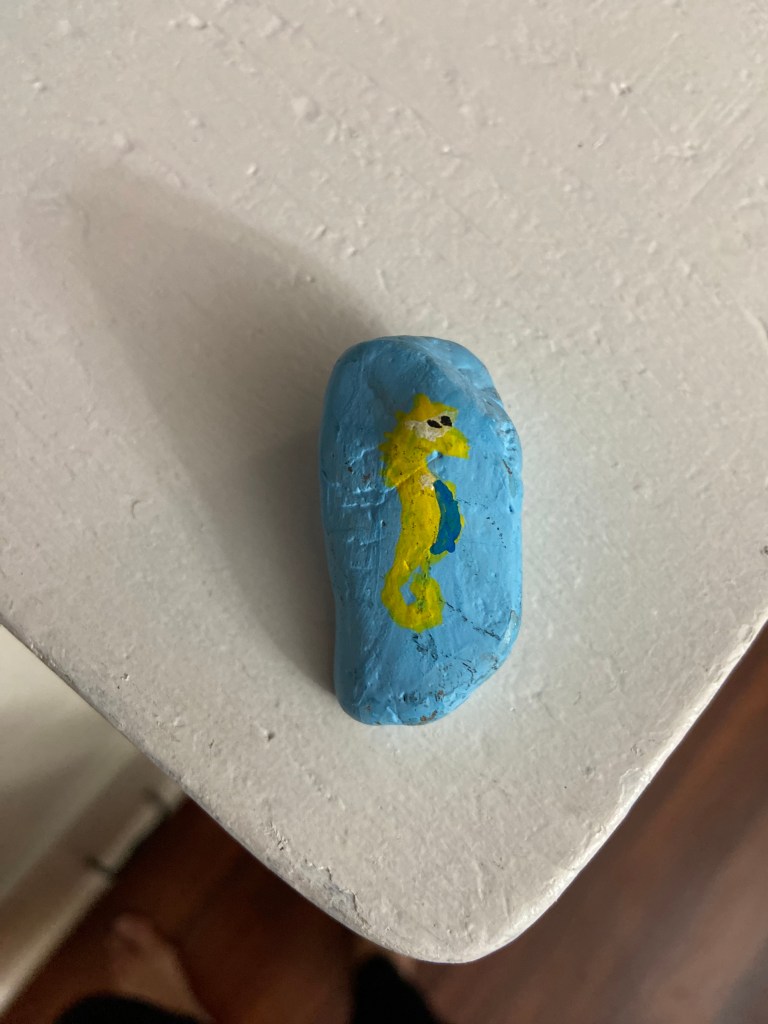 I spread out the plastic craft tablecloth on the dining room table and we got to work. We used every single color to paint every single rock. We used a different brush for each color, and when they all had paint on them, I rinsed them out and we got back to work. He did mostly solid colors. I painted a few rocks al one color, and when they dried, added a sea creature. That’s what we originally wanted to do. I painted a sea turtle, a jellyfish, an angel fish, a flamingo, and a dolphin.