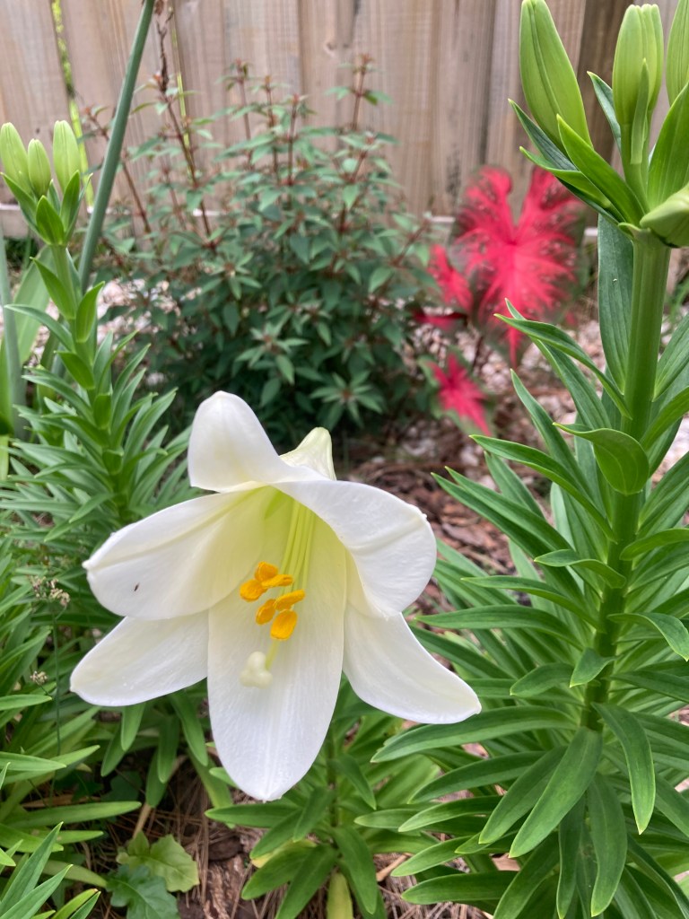 It’s Easter in my garden. The lilies are blooming! I know Easter Sunday was April 9. But each spring, the lilies in my garden are late arrivals. I don’t mind. Technically the church season of Easter lasts seven weeks, so they get a pass.
