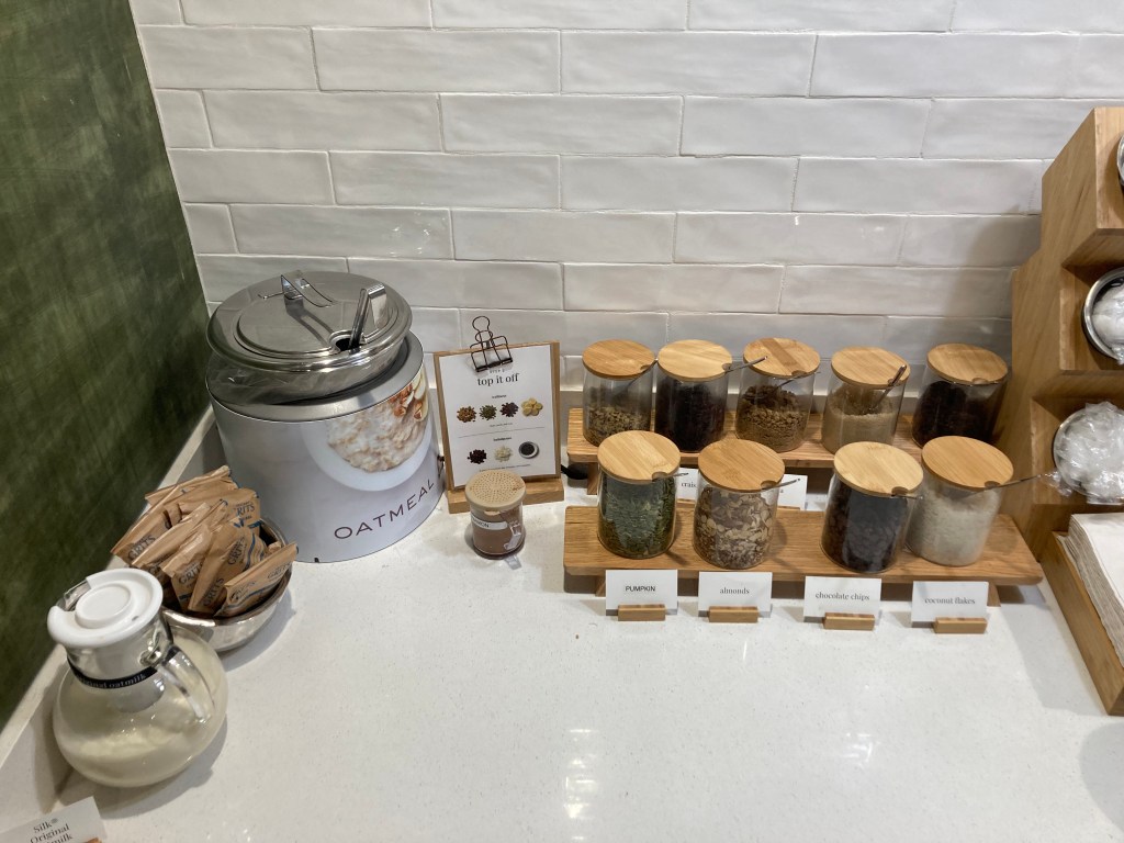 That’s right, a steaming pot of freshly prepared oatmeal with nine optional toppings sat right there next to a pitcher of oat milk and a shaker of cinnamon. Wait a minute. Nine toppings? That’s right. Walnuts, craisins, granola, brown sugar, raisins, pumpkin seeds, sliced almonds, chocolate chips, and coconut flakes.