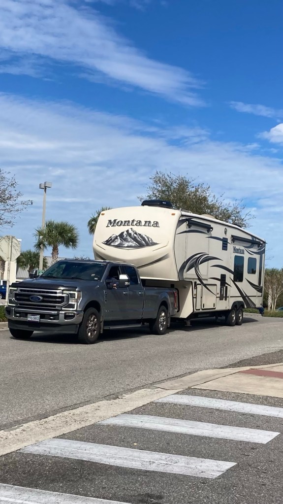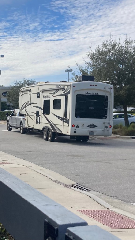 Yikes. I couldn’t help but ask out loud, “Where are you going to go with that thing?” It’s hard enough getting in and out with a compact car, never mind a pickup towing a forty-foot fifth wheel.