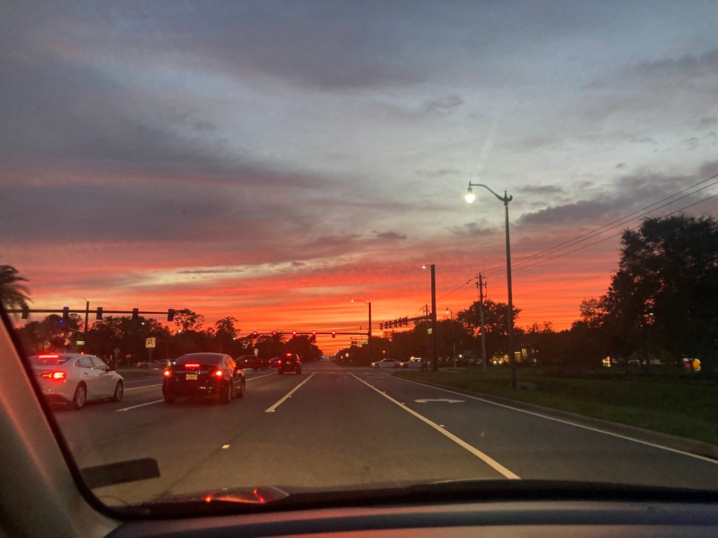 A photo can’t capture the palette of colors on the horizon. Who knew there could be so many oranges, reds, and yellows? If kept driving west, would I eventually reach a blazing fire lighting up the sky? Would I reach an active volcano, glowing with molten lava? Is someone smelting steel in a giant blast furnace off in the distance?