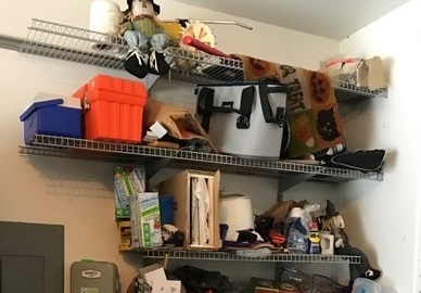 After I got some better hollow wall anchors at the hardware store, I reattached the shelf and decided to put all the organizer boxes of nails, screws, nuts and washers in a workbench drawer. Lighter things like a can of WD-40, picture hanging hardware, the box of batteries, and some extension cords were fine up on the shelf.