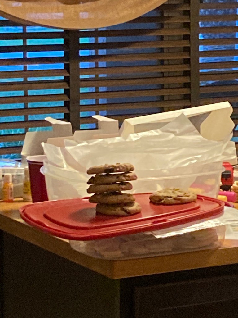 I did a double take as I passed by the kitchen and saw a pile of homemade Loaded Chocolate Peanut Butter cookies balanced on a teetering plastic container lid. What could possibly go wrong?
