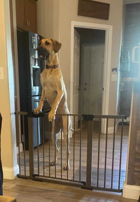 That’s plenty big for us. She already fills up the tub at the do-it-yourself dog wash. It took two of us to hold her while a groomer trimmed and dremeled her nails. When she stretches out, she can reach both sides of our king size bed. She doesn’t grab food off our plates, but once in a while her tongue comes very close to licking our meal.