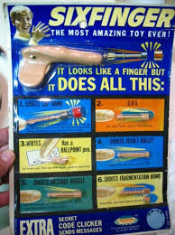 In the mid 1960’s, Topper Toys actually sold a Sixfinger toy spy gun. It shot five different projectiles, could be used as a secret code clicker, and transformed into a ballpoint pen.