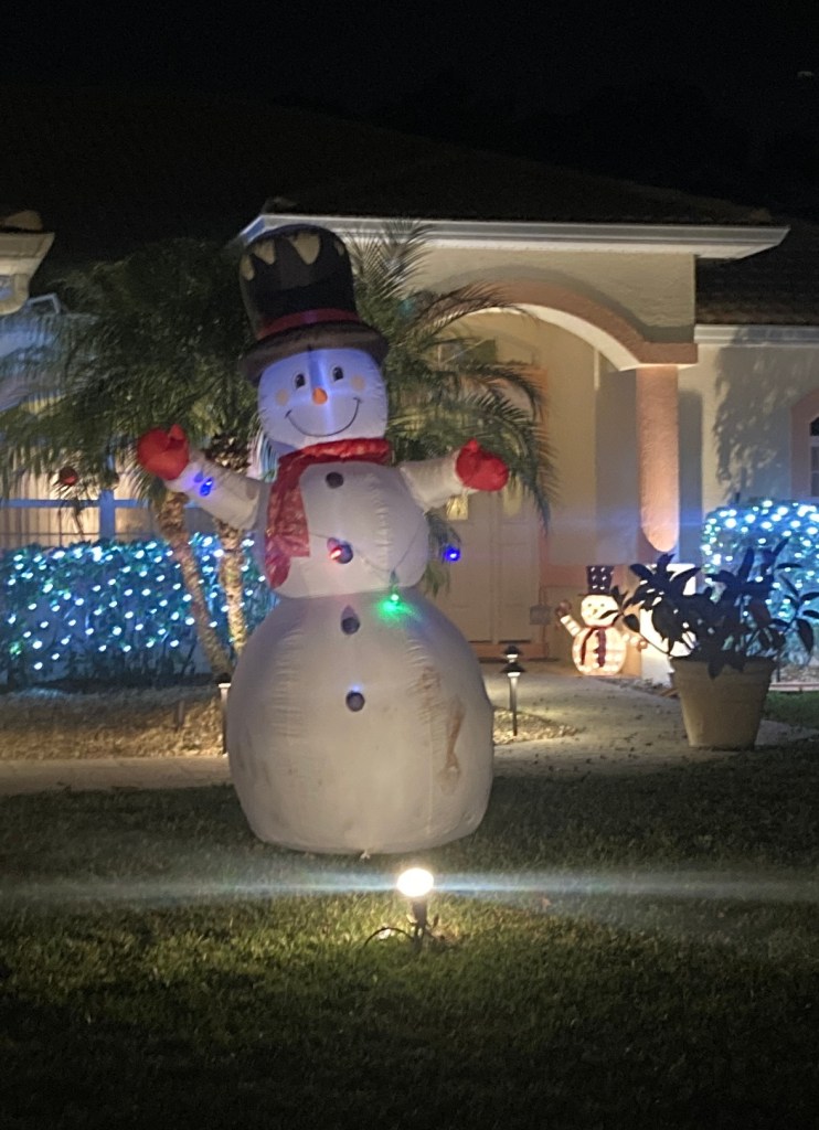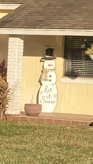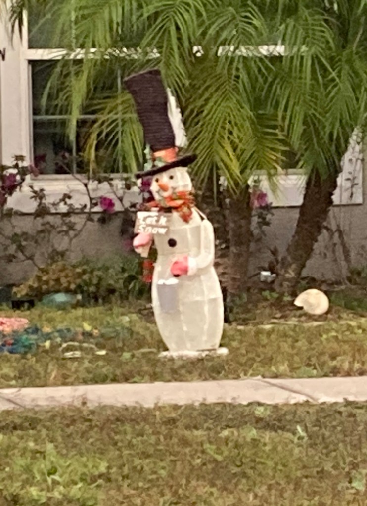I love seeing snowmen in Florida. Ironically, they wear hats, scarves, and gloves, as if snowmen could get cold.