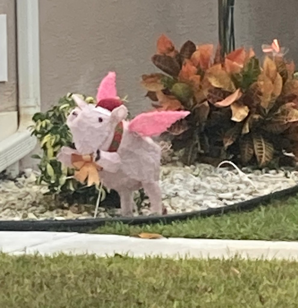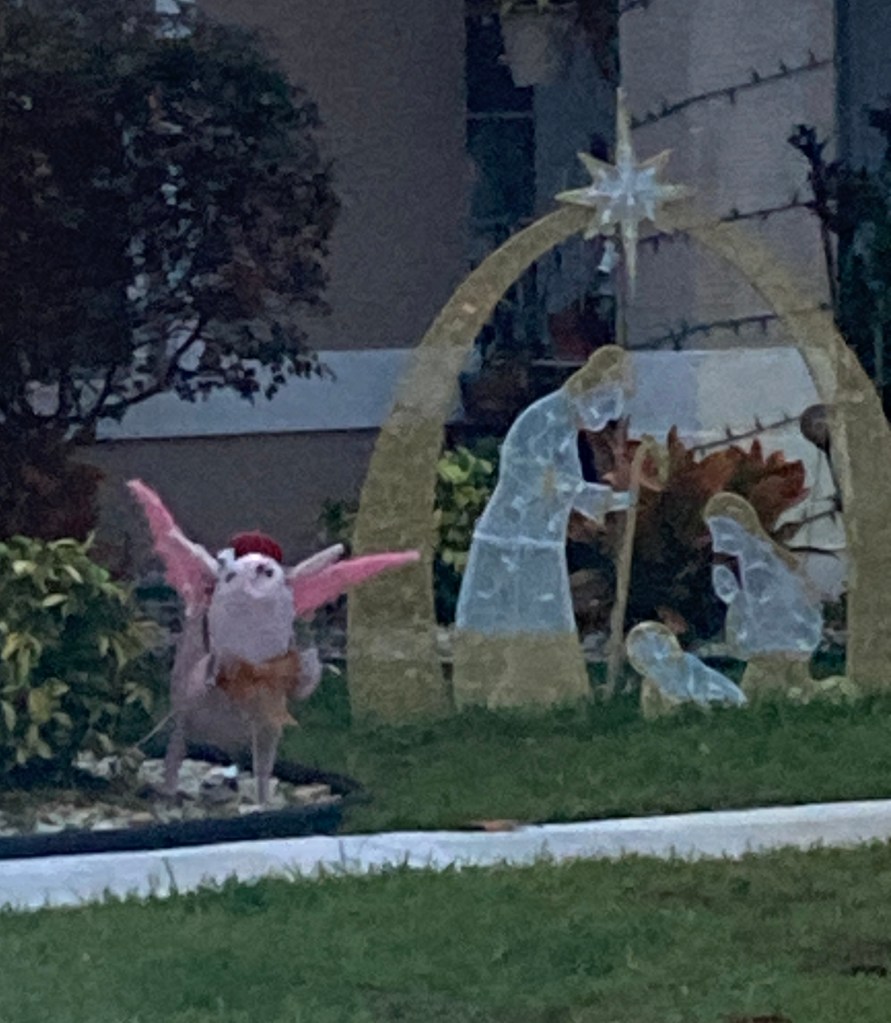 Anything with a Santa hat is now part of the Christmas landscape. From turtles to flamingoes, pigs to dinosaurs, all are welcome to join the cast. As long as you have a storage unit for the other ten months of the year.