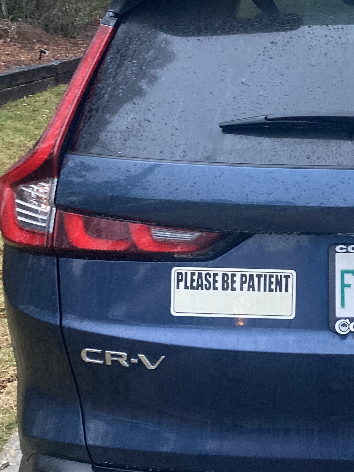 I’ve been walking past this car with a “Please Be Patient: New Driver” magnet sticker for longer than a year. It’s been there so long that the “New Driver” words have completely faded.