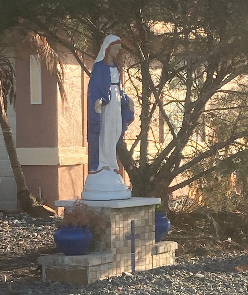 I’ve been noticing the statuary in the front yards I pass on my morning walks. One that piques my interest is Mary. The one pictured here is a full-sized representation of the mother of Jesus.
