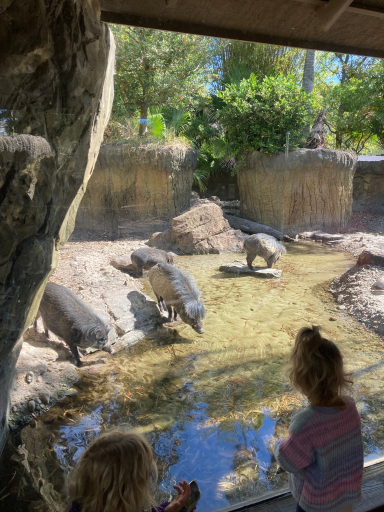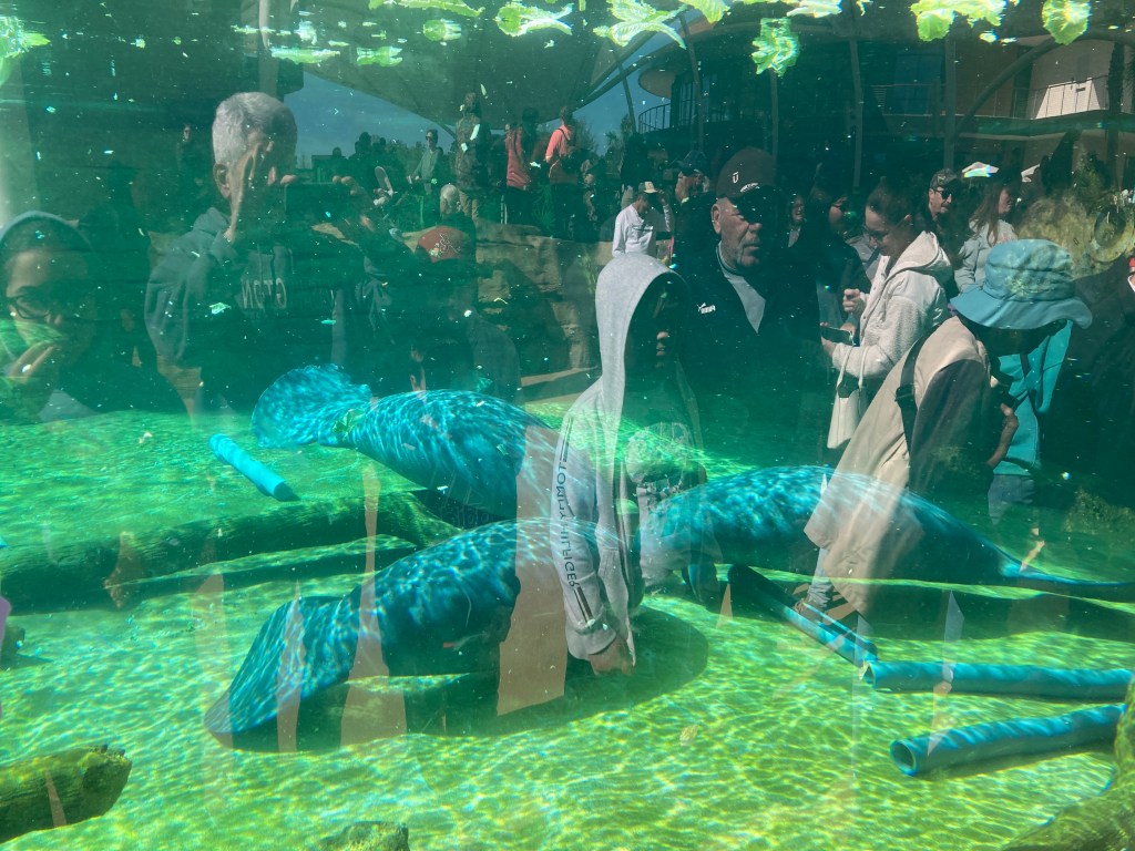 We visited the Jacksonville Zoo for the first time in about six months, and wow, has it changed! They’ve finished the new entrance, added many new walkways and a 330,000 gallon manatee rescue/rehab tank. These three manatees sure enjoyed their new environment, as did a large crowd of folks on a cool, sunny, spring break day.