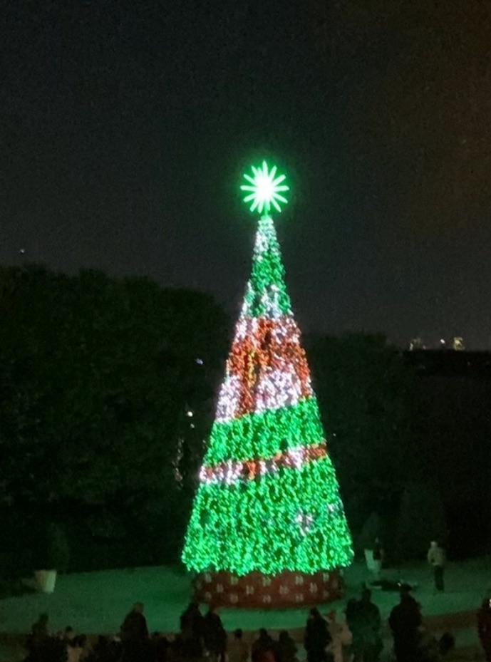From what I could see, every tree in the arboretum was wrapped in lights. A Christmas village featured little shops for kids to visit and get treats. The twelve days of Christmas were displayed in gazebos along the garden walkway. Lights on the giant Christmas tree flashed colors and shapes in time with music.