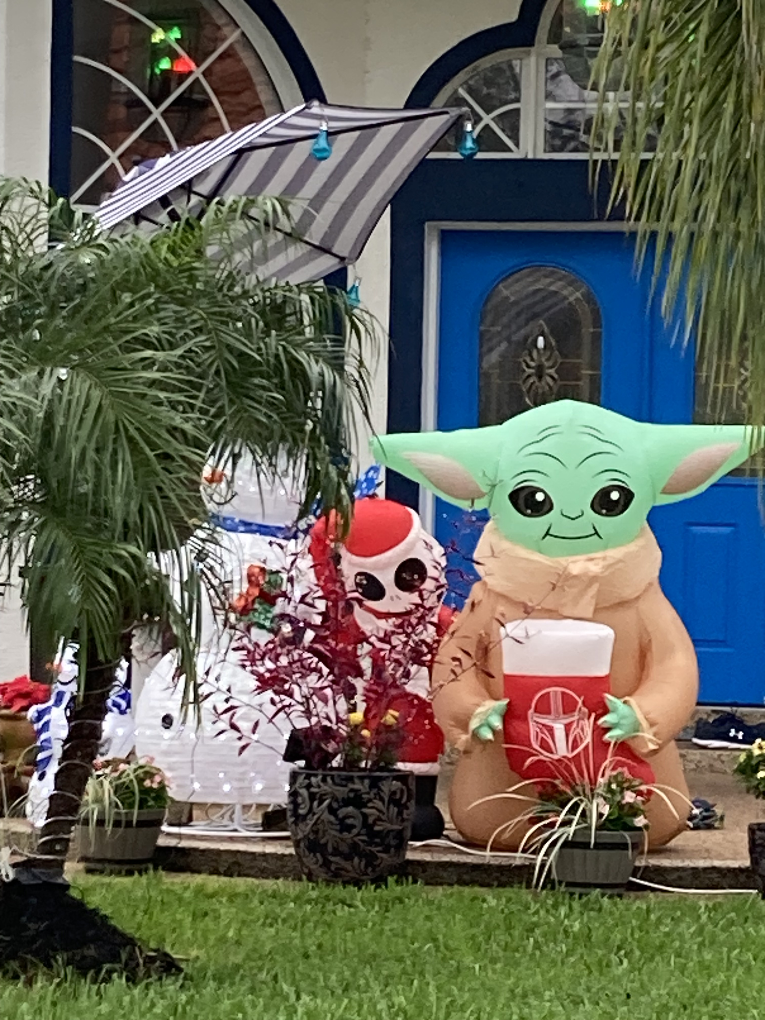 Here’s a collection of strange characters. This year, someone decided gnomes looked enough like elves to include them in Christmas decorations. The cast of Christmas characters now includes Jack Skellington, Grogu (baby Yoda), Baby Shark, a goat, a unicorn, polar bears, and a frightened crab.