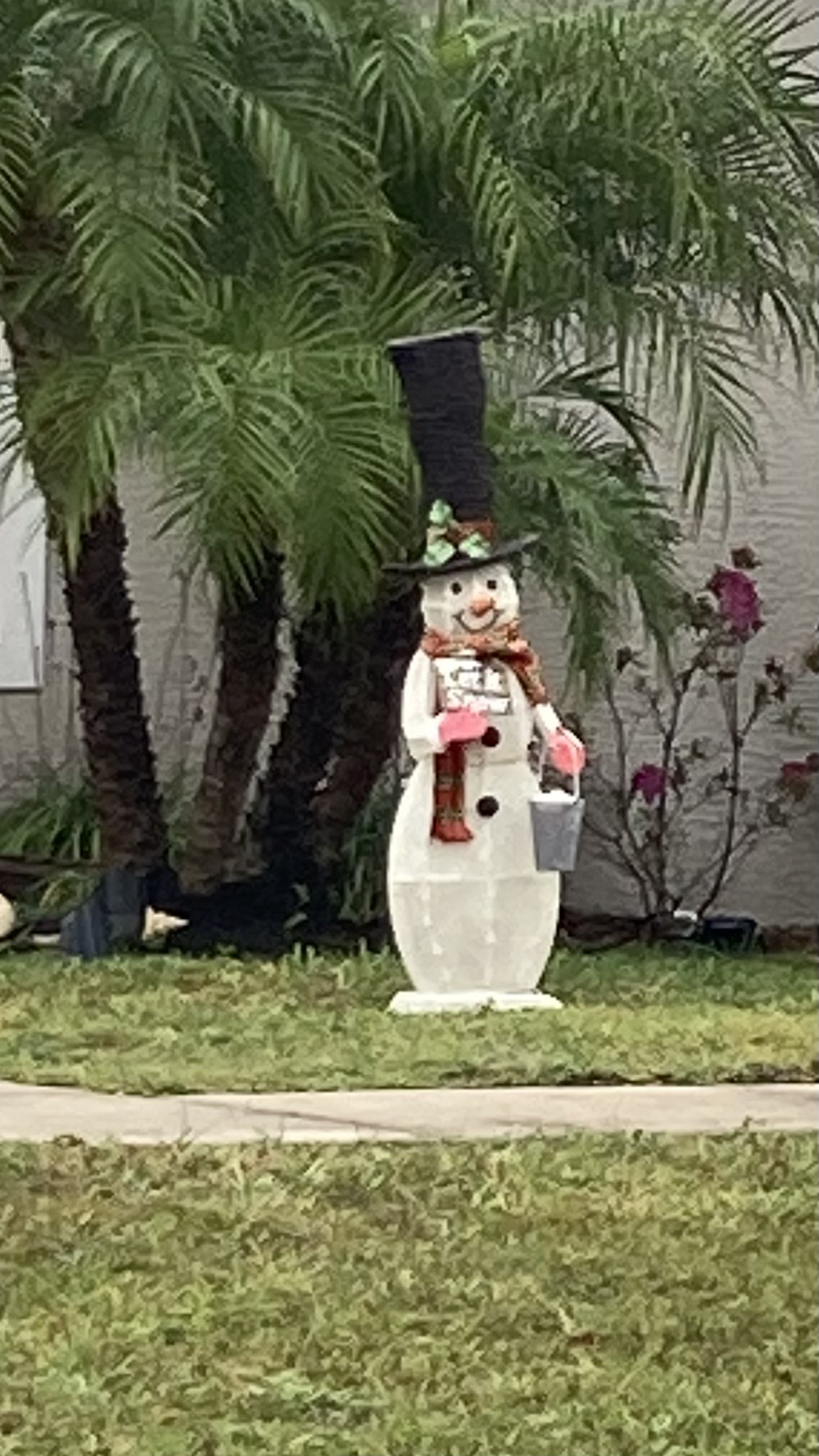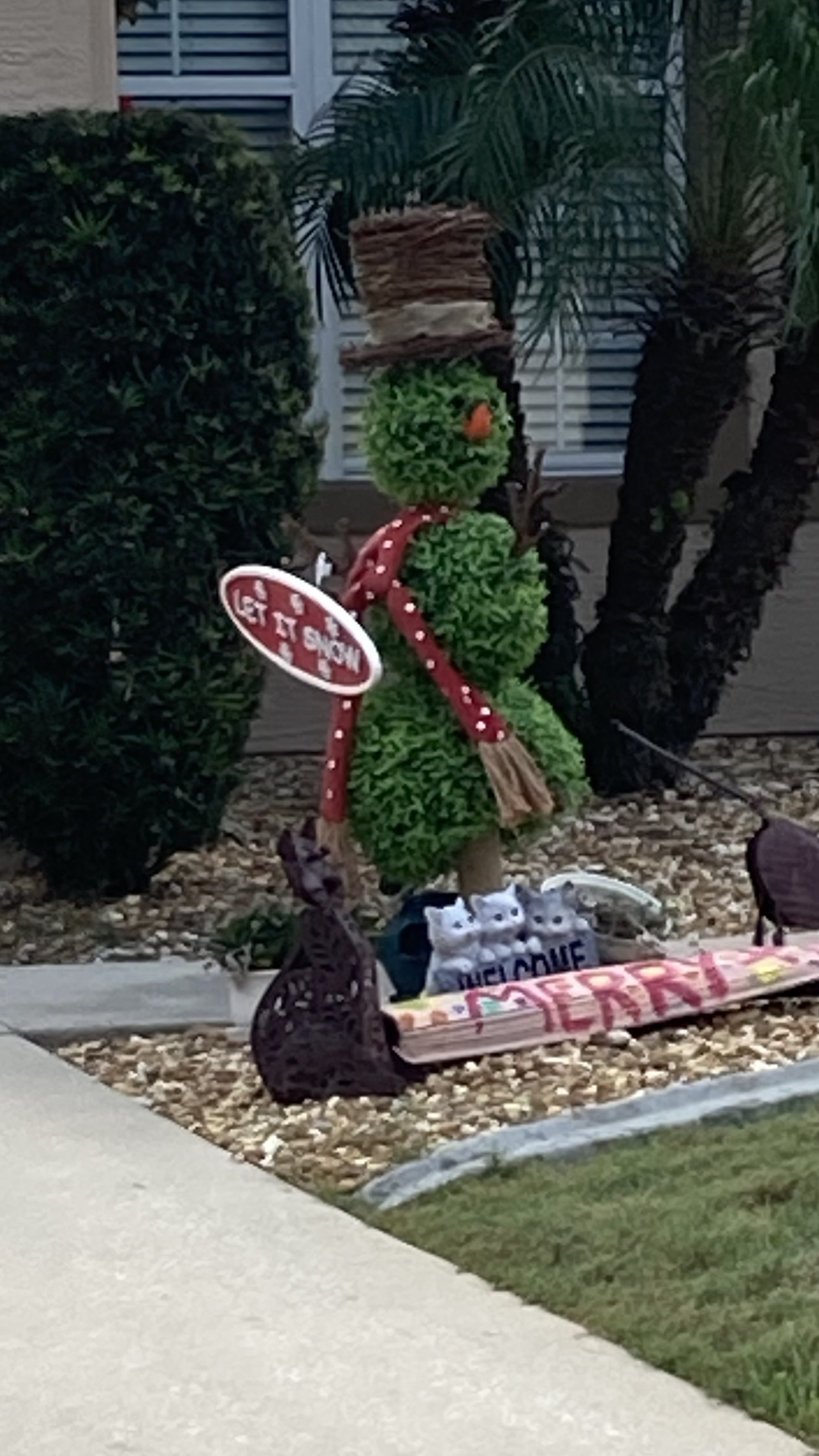 Snowmen rule the front yard displays this year, even here in Florida. As you can see, snowmen are happy, marry and raise families, and are athletic. They all dress for winter weather. I especially like the unique green imitation shrub snowman.