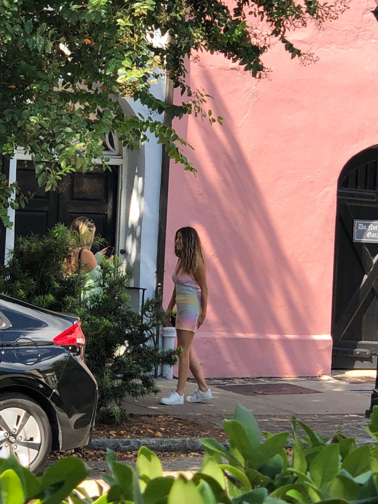 When my wife and I went to Charleston, SC in September, we got down to Rainbow Row in the historic district of the city on East Bay Street. As we stopped to take pictures from across the street, we just happened to catch this young lady wearing a dress to match the colors of the row homes.