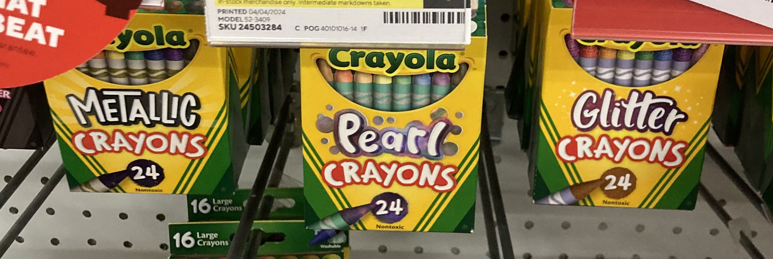 But wait. There’s more. I turned the corner and saw another display with a box of one hundred and twenty crayons! “120 Different Colors”! Wow. That’s almost double what I thought was the ultimate box of crayons.