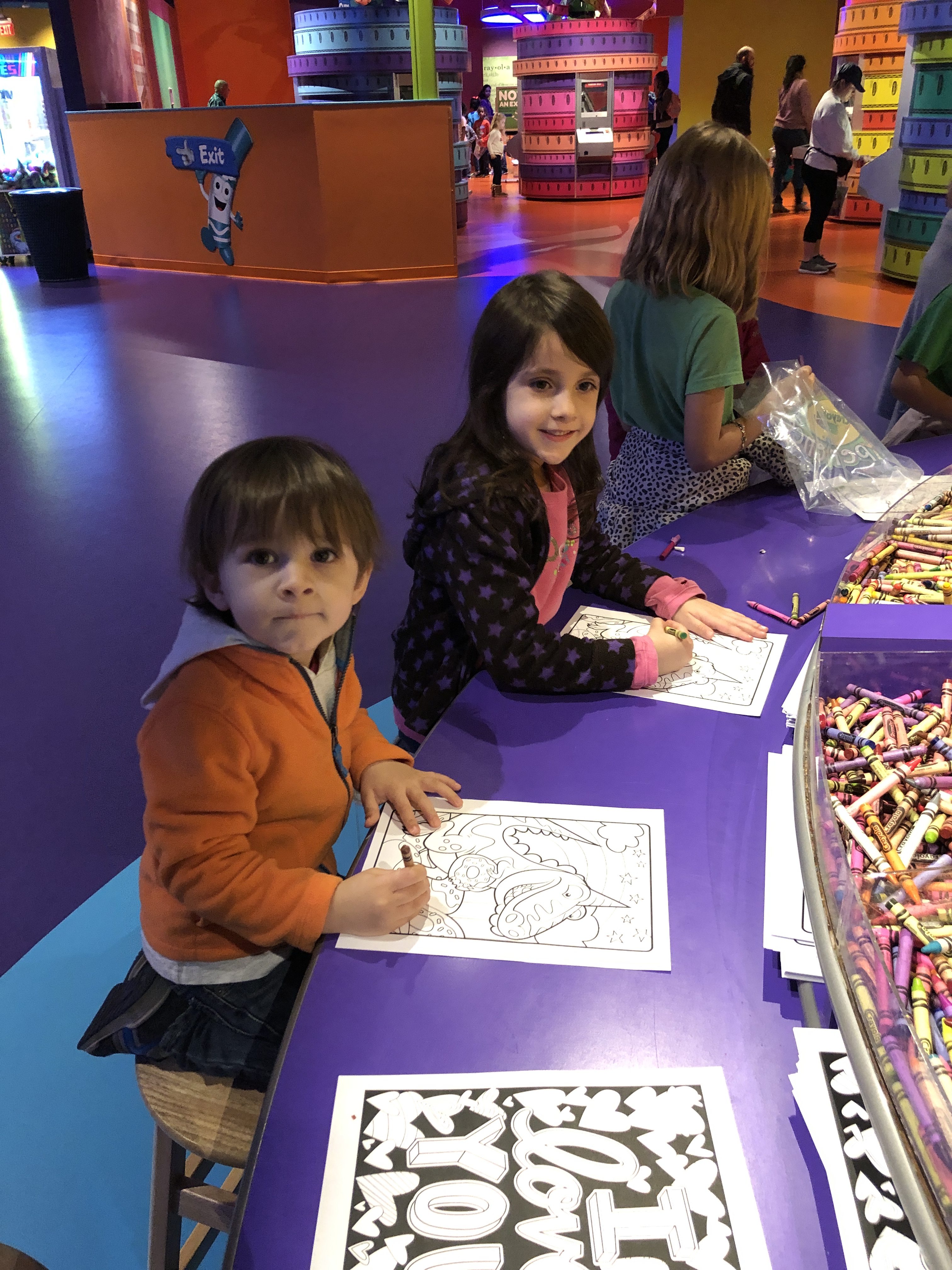 No time to waste. Off to a coloring center. Here you sit at a counter and there are bins and bins of brand new crayons right there in front of you. Classic colors. Metallic colors. Pastels and browns and blues. Niche colors, like Mac-n-Cheese. It was amazing. Off to the side, you could stand in front of a camera and have a line drawing of yourself printed to color. Very cool. I made sure I scanned the pic on my phone so we could make more later.