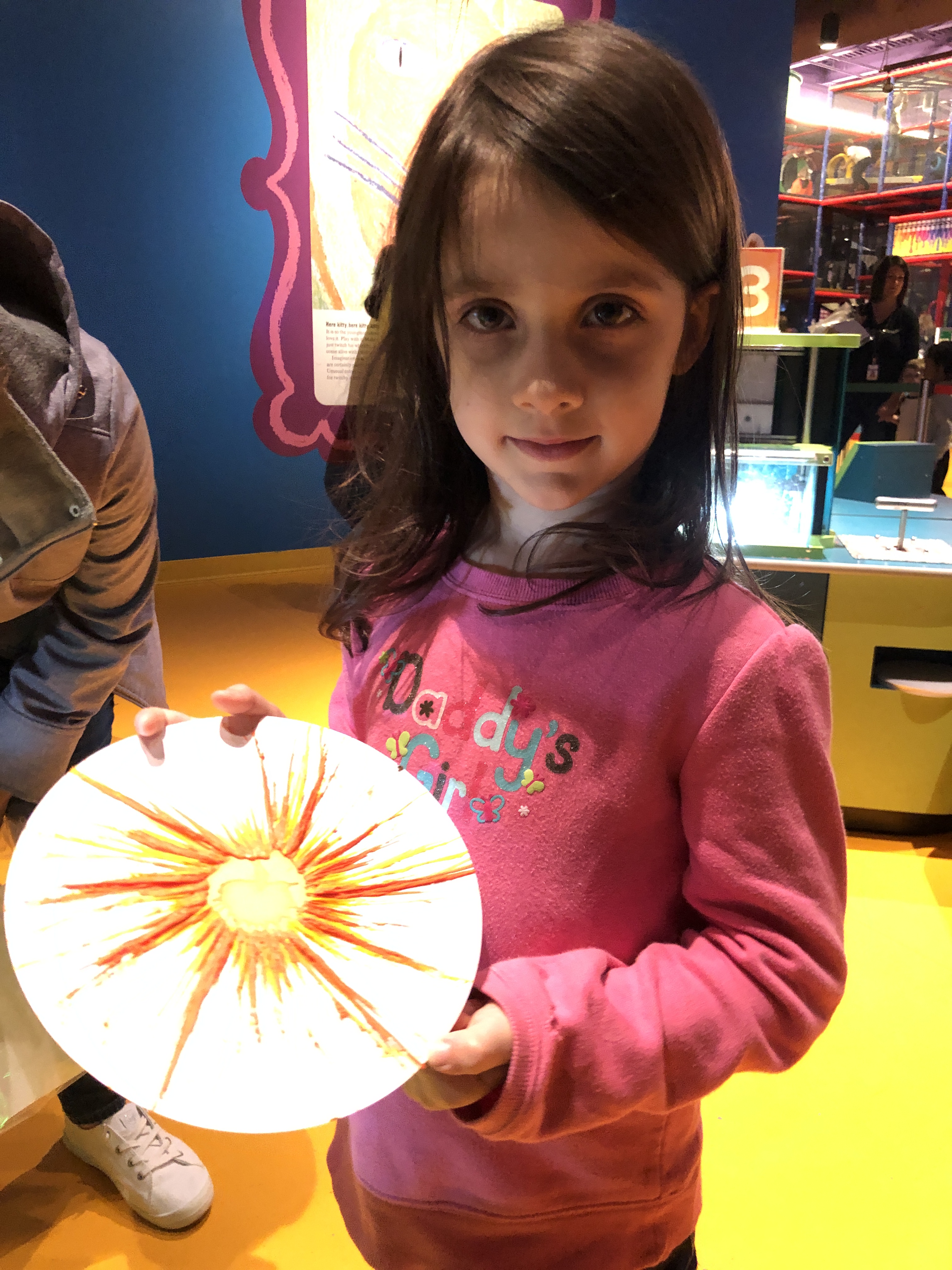 We didn’t stay there long. There’s a spin art station. You put a crayon in a slot, the paper spins, and melted crayon makes a sunburst design. A second crayon adds an additional color. It quickly dries, we carefully take it from the spinner, and put it in our plastic bag keeper.