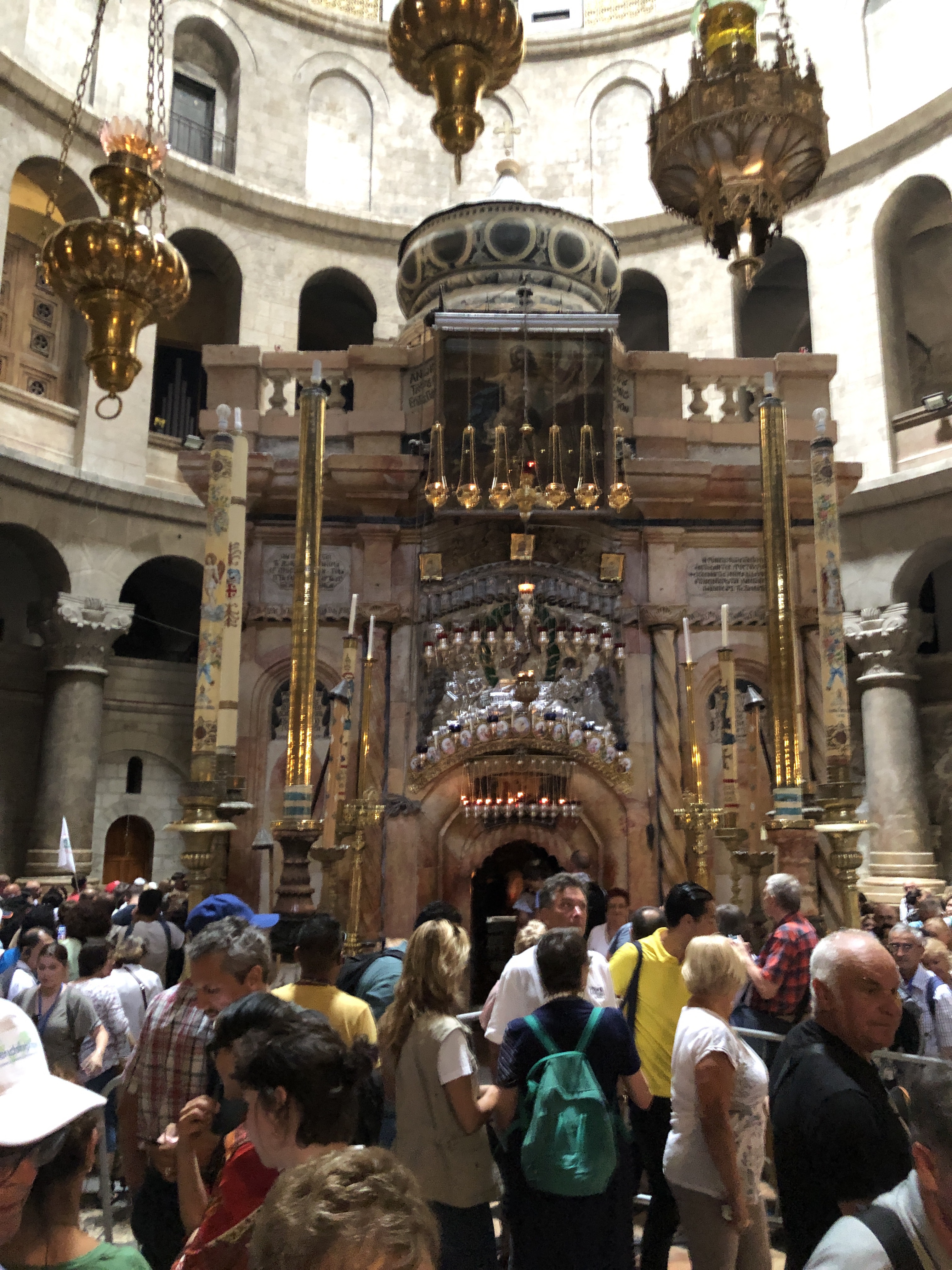It was not quiet at all in the church of the Holy Sepulcher. I thought the place was packed, but our guide said it was only about 60% of what she had seen. Crowds of people in long lines and constant conversation in every conceivable language surrounded us everywhere we went. We did not stay long, but it is a busy, busy place!