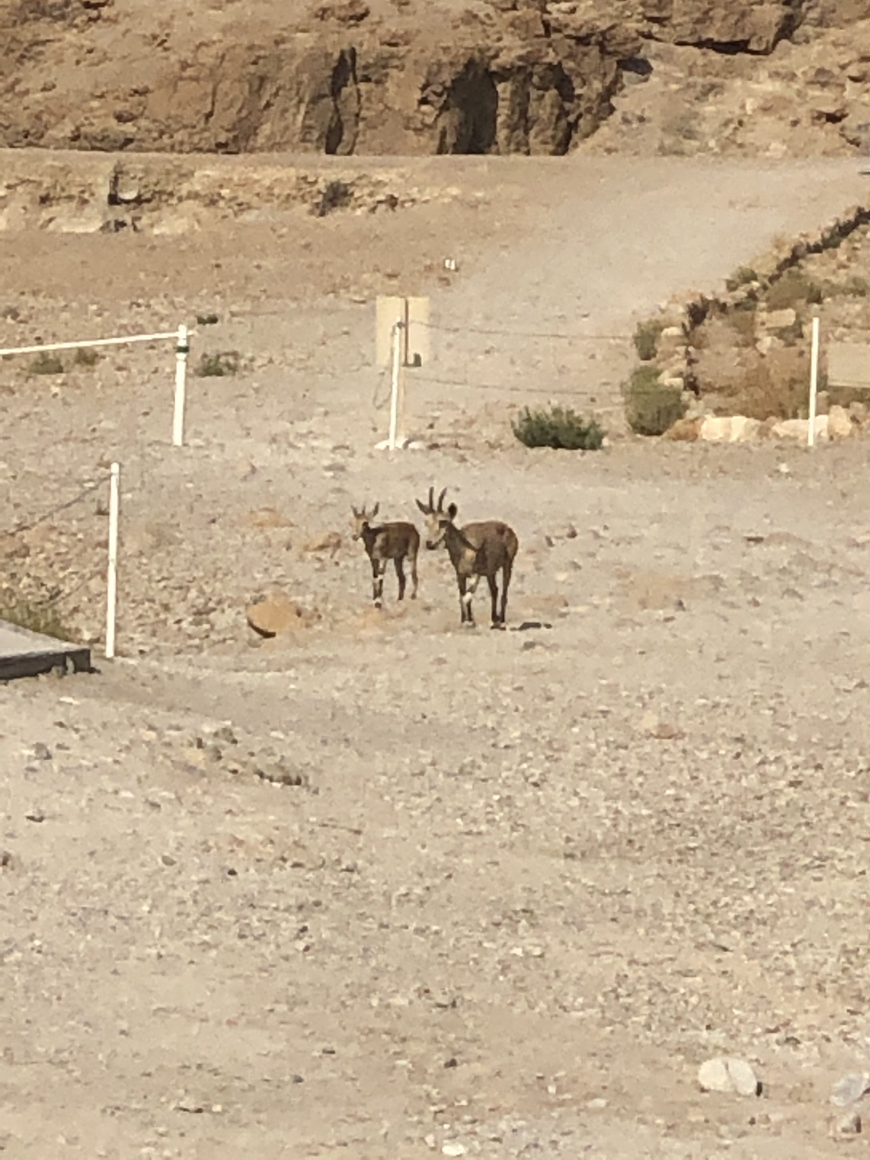 Our journey today took us first to Qumran, where the Dead Sea scrolls were found. The uncovered ruins revealed much about a community that was able to thrive in a dry, barren, hilly wilderness. Ibex wandered ahead of us on the path to see some of the caves.