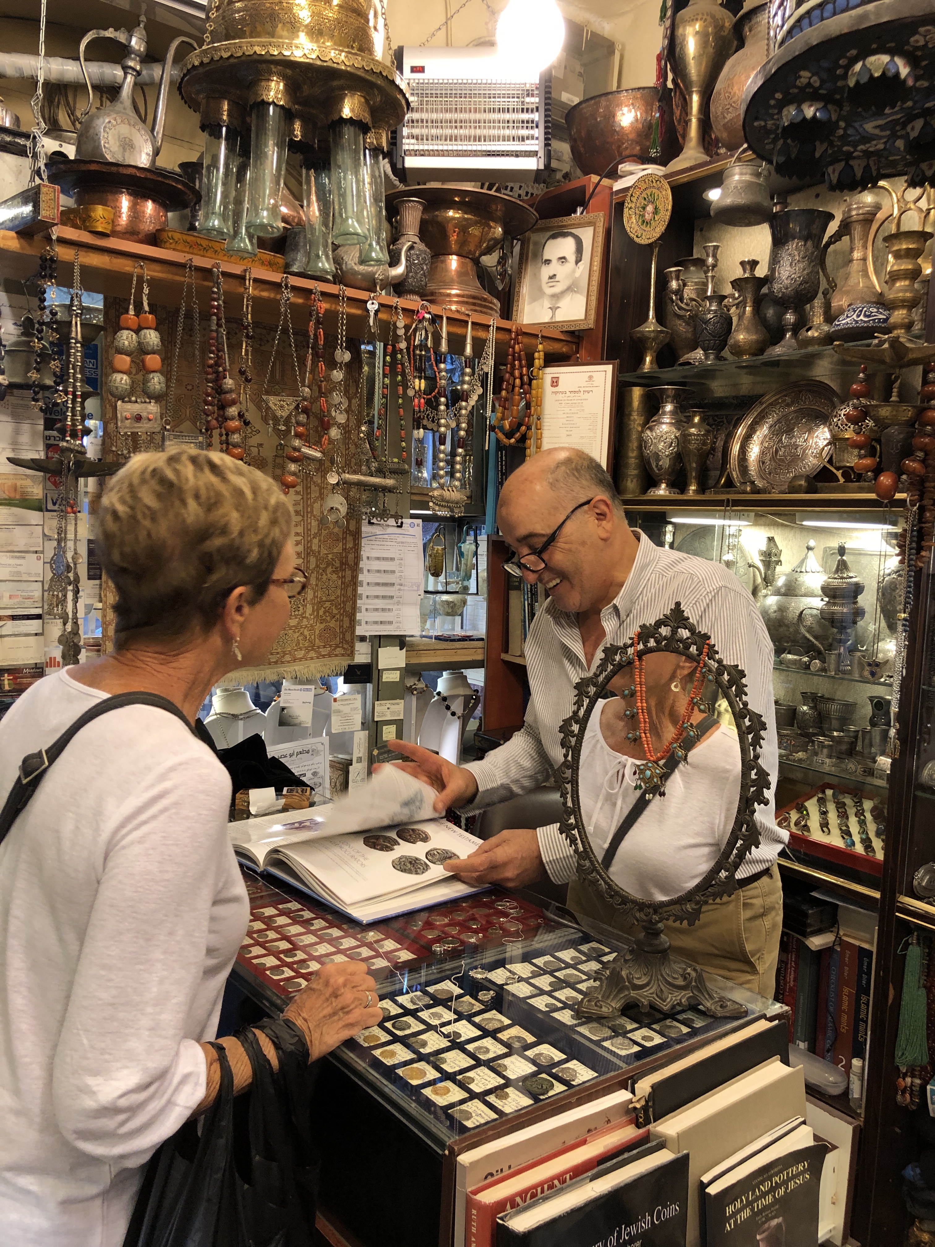 He dropped us off at the Jaffa gate, after we got our bearings, we headed down through the Arab market. We happened across Bassam Barakas, a fourth generation antiquities dealer who had more to offer than the usual trinkets (like yarmulkes with NFL logos). We purchased a pendant with a “widow’s mite” from the 1st century B.C. from him.