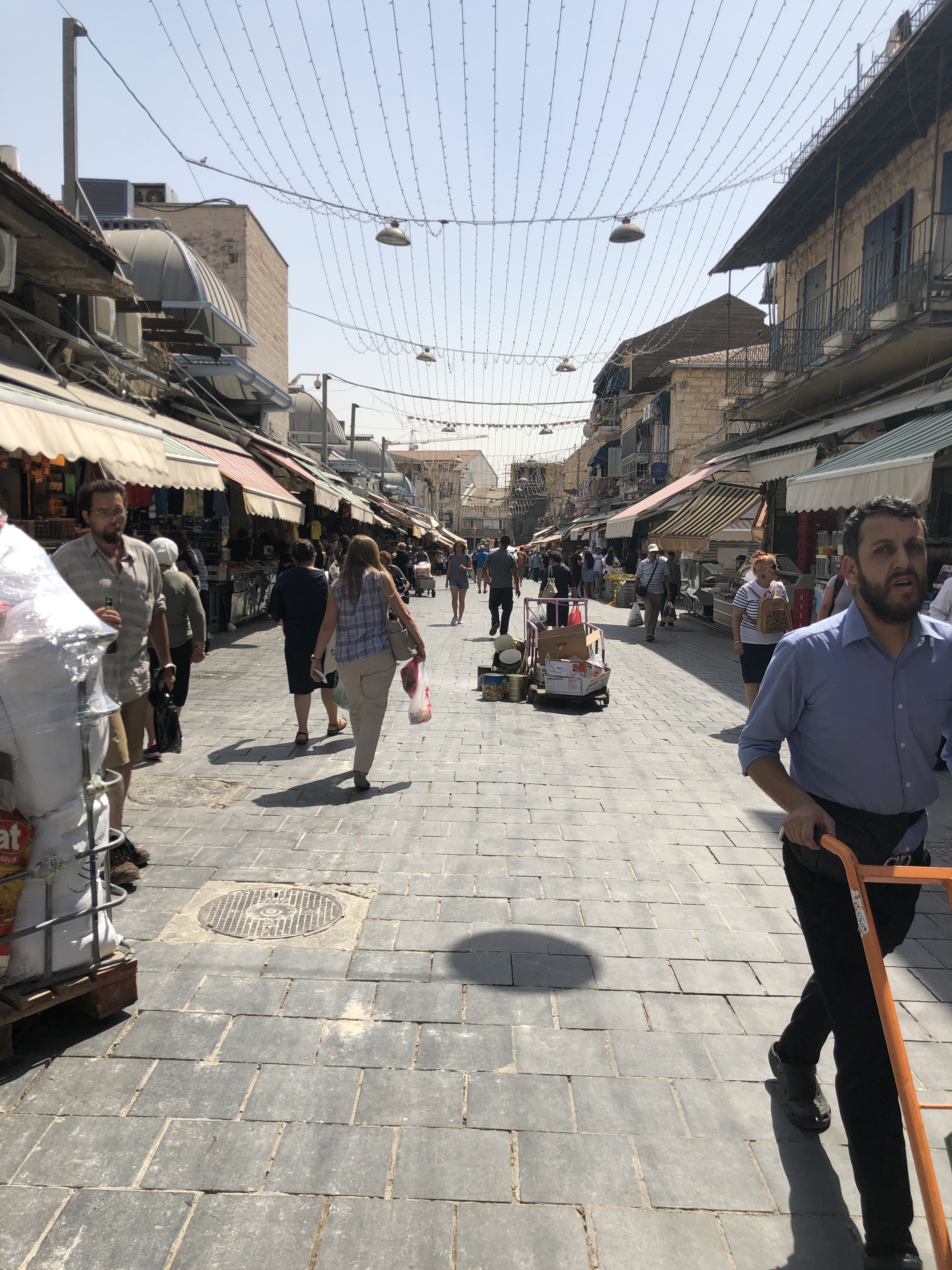 Sitting on the train, I looked up and saw a sign announcing the next stop – in Hebrew. I can figure out some Hebrew, but now quickly. Before I knew it the announcement changed to Arabic. Not helpful. Finally came the English. We reached the stop specially designed to bring traffic to the market, and started down the street.