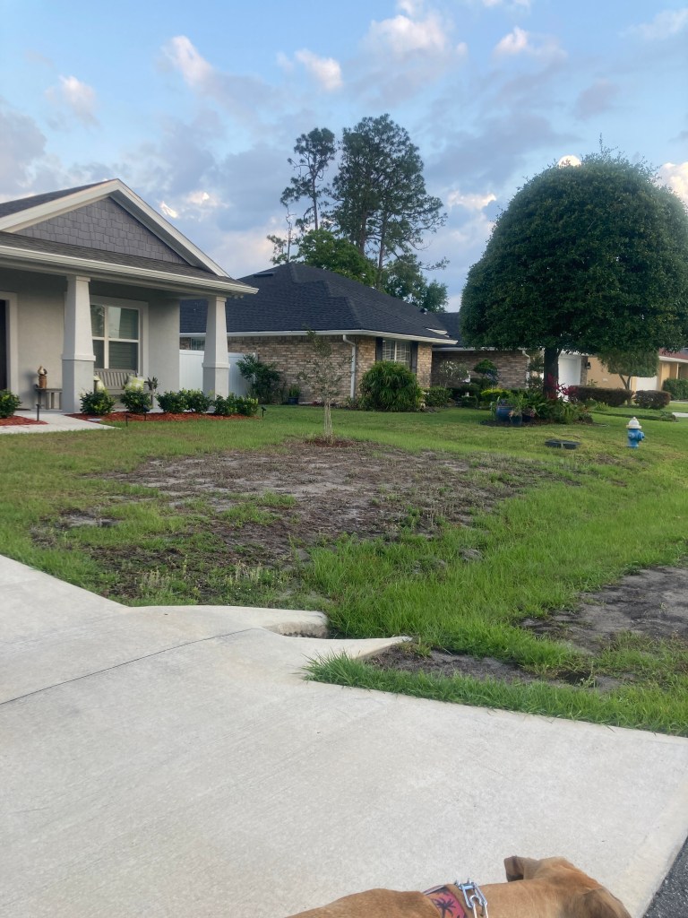 Somehow he snuck the car in between a large tree and the front sidewalk, driving into the front yard. I cringed. It’s been raining a lot, drainage swales are full, and the ground is soft. “There’s no way…”