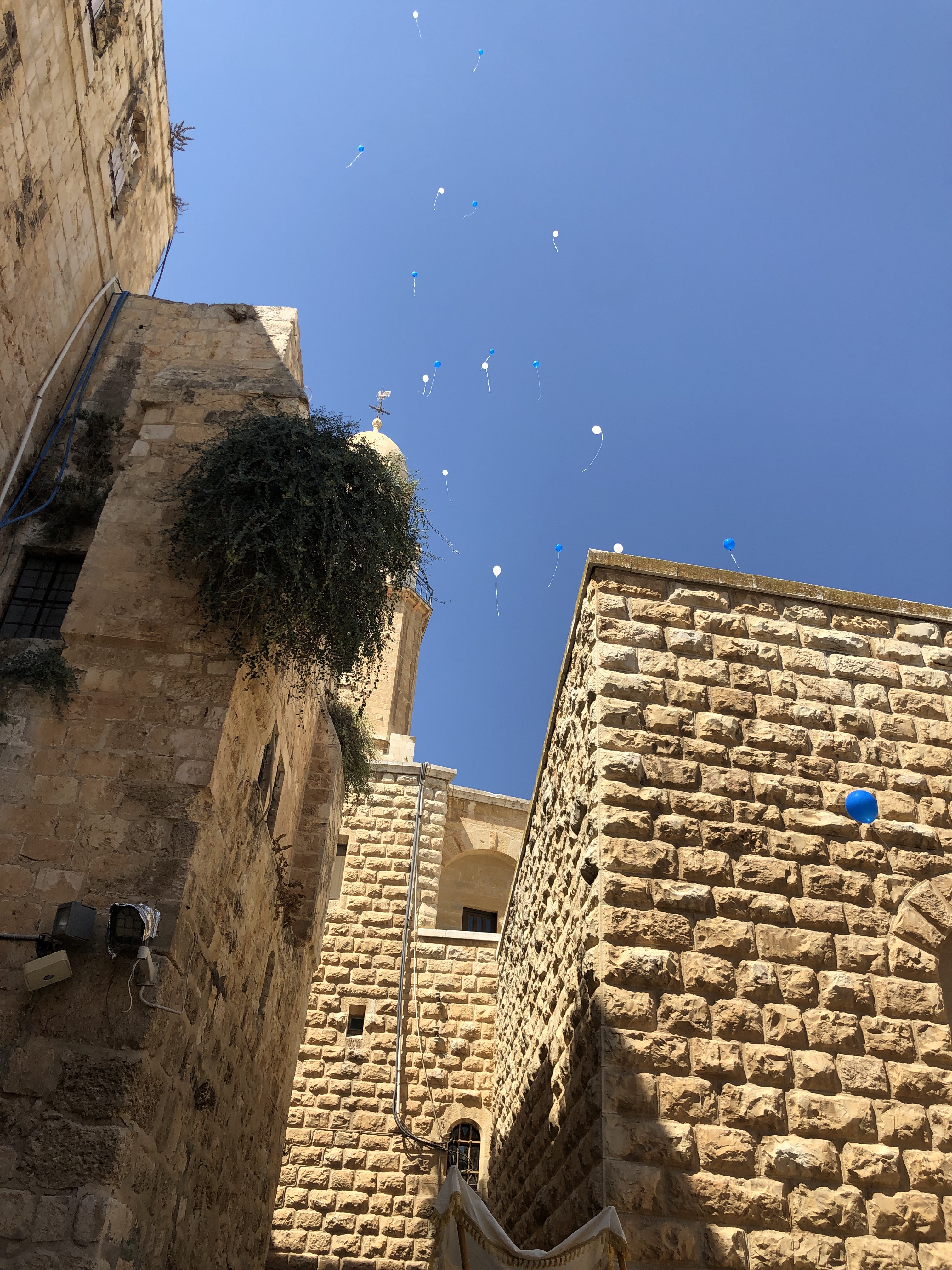 On the way to King David’s tomb, we ran into a special Jewish family celebration. A little three-year old boy was about to get his first haircut! He didn’t seem too happy about it, but the family and many bystanders joined in songs, cheering, and a blue and white balloon release.