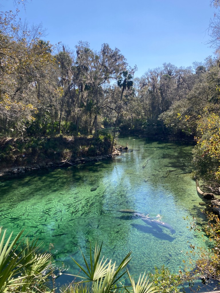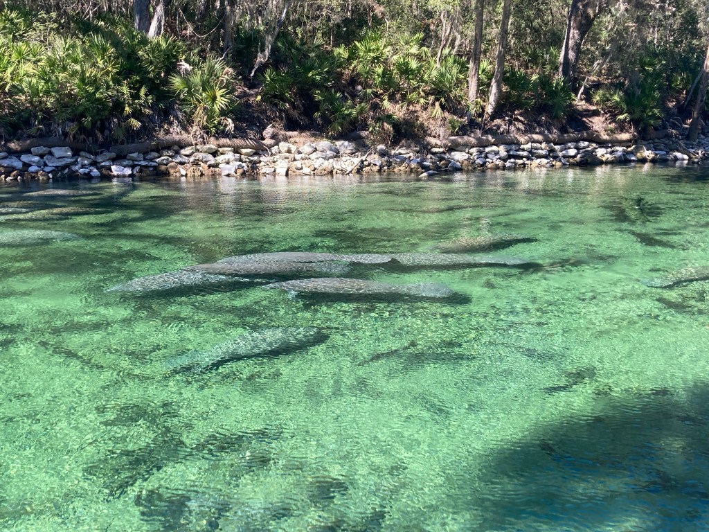 As we pulled up to the ranger station at Blue Springs State Park in Orange City, Florida, a sign announced the presence of 900+ manatees! After two straight nights of atypical twenty-degree overnight weather, more of the big aquatic mammals had swam into the 72-degree waters than I had ever seen before.